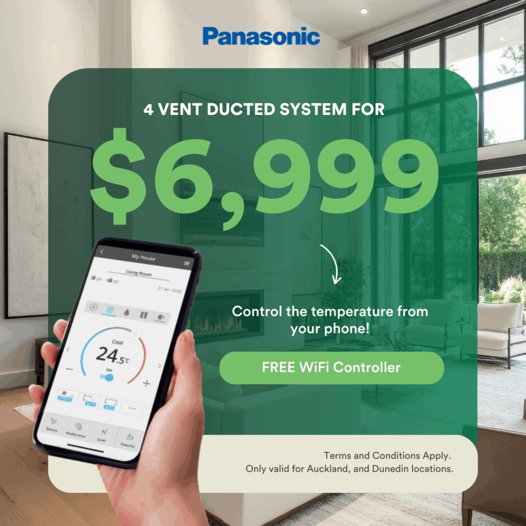 A Panasonic ducted system delivers even, reliable temperature control throughout your entire home – fully installed for just $6,999, with a bonus WiFi controller included. Control the temperature from your phone, wherever you are.